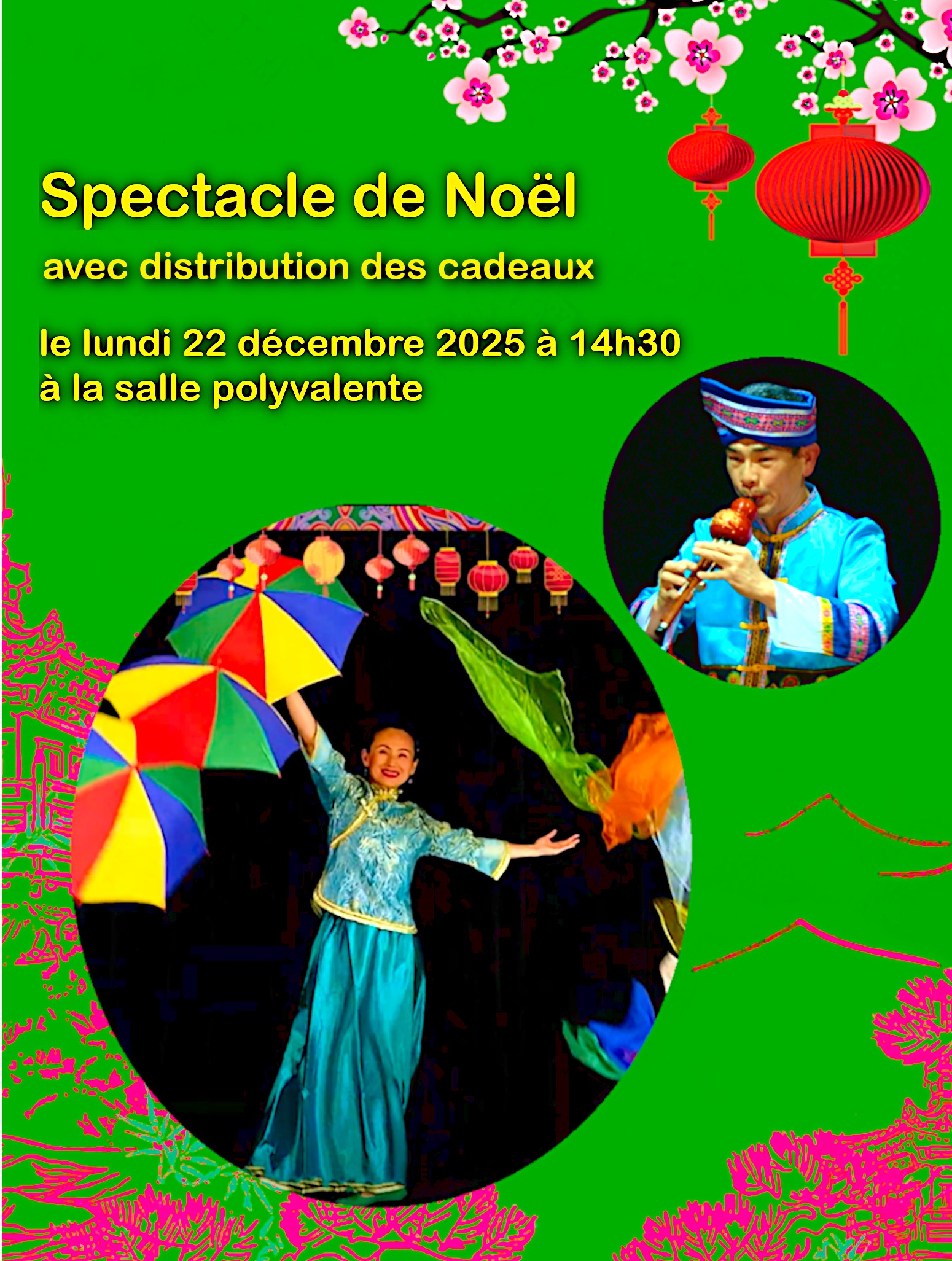 Spectacle de Noël " Douceur de Chine" Lundi 22 décembre 2025 Un après-midi magique vous attend avec le Spectacle de Noël suivi de la distribution des cadeaux ! Rendez-vous à 14h30 pour partager ensemble ce moment de fête et de bonne humeur .